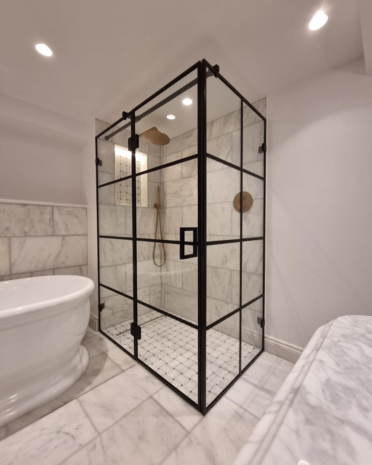 Bring industrial elegance to your bathroom with our bespoke Crittall-style shower enclosures. Inspired by classic steel-framed glazing, these designer shower screens combine slim black grid detailing and toughened safety glass to create a statement feature—ideal for contemporary and heritage interiors.